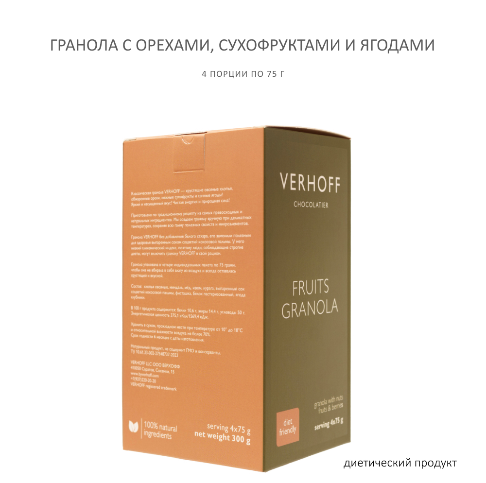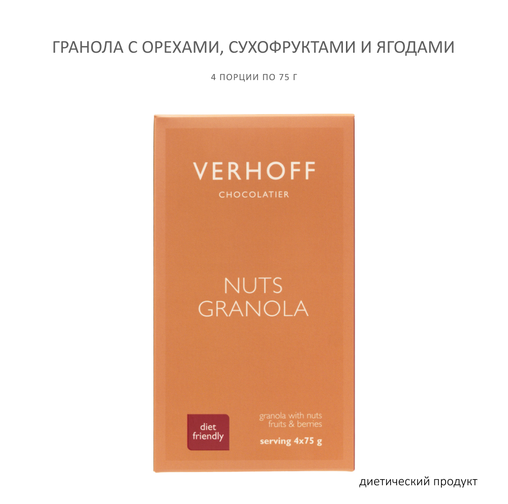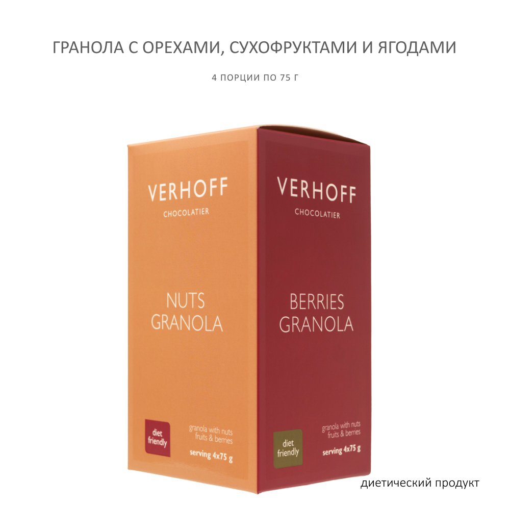 Классическая гранола VERHOFF — хрустящие овсяные хлопья, обжаренные орехи, нежные сухофрукты и сочные ягоды! Яркий и насыщенный вкус! Чистая энергия и природная сила!