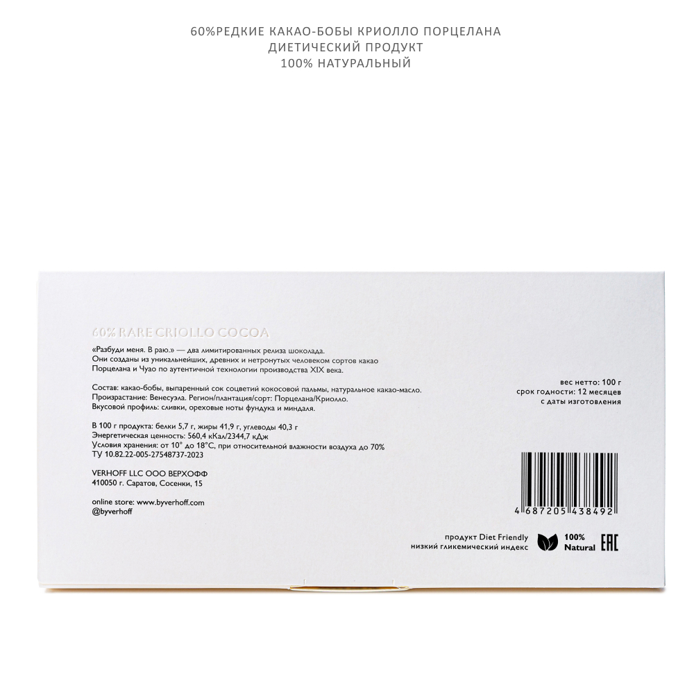 Эти какао-бобы поистине подлинного происхождения, древнейшие и крайне редкие. Чтобы привезти их в очень ограниченном количестве, потребовались огромные усилия и больше года времени. Релизы «Разбуди меня.» и «В раю.» — это редкая возможность прикоснуться к прекрасным творениям природы, явившим собой уникальные эталонные вкусы, которые пробудят вас в настоящем вкусовом раю.