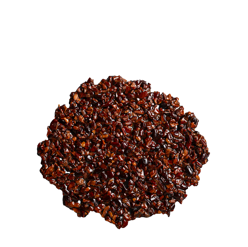 Мы деликатно обжариваем какао-бобы и дробим до состояния крупки. После чего исходный компонент шоколада укрываем солёной карамелью, перемешиваем и выкладываем тонким слоем. Так создаётся сладкий десерт необычной формы, пробуя который, вы чувствуете всю вкусовую особенность какао-бобов и их природную ароматику.