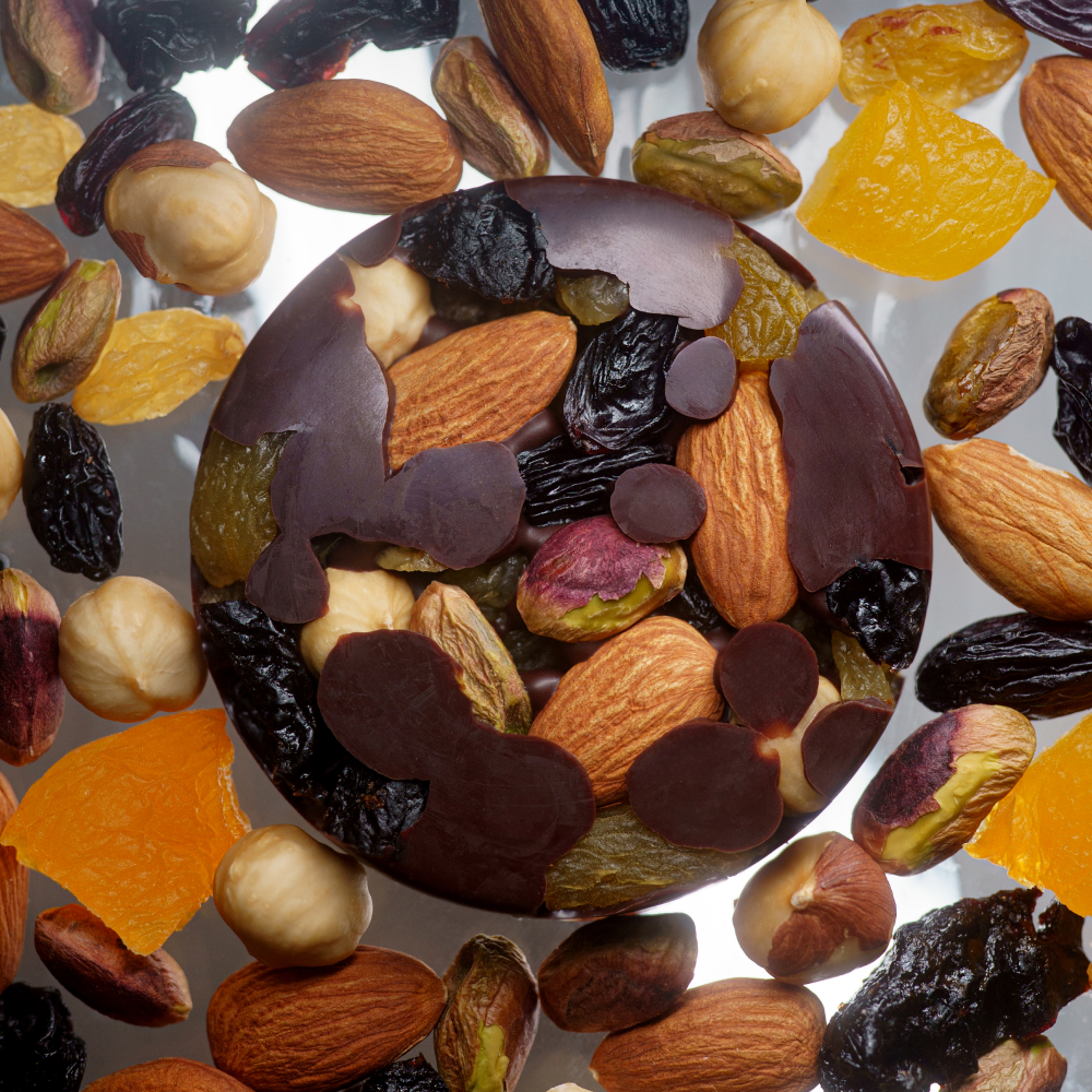 Состав: шоколад 66% (какао-бобы, выпаренный сок соцветий кокосовой пальмы, натуральное какао масло), миндаль, фундук, фисташка, курага, чернослив, изюм.