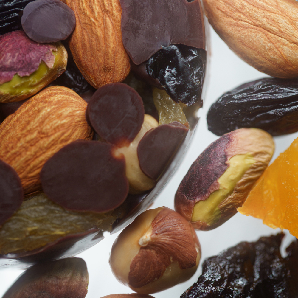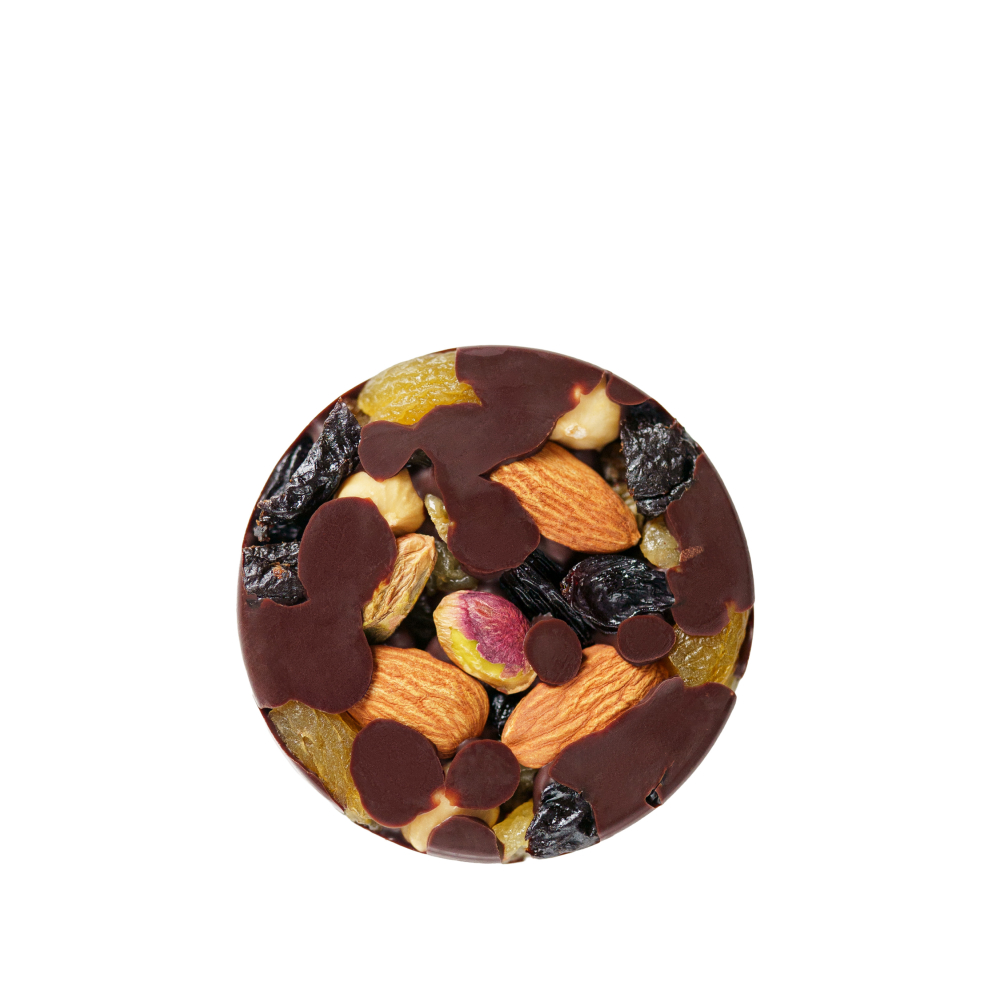 Состав: шоколад 66% (какао-бобы, выпаренный сок соцветий кокосовой пальмы, натуральное какао масло), миндаль, фундук, фисташка, курага, чернослив, изюм.